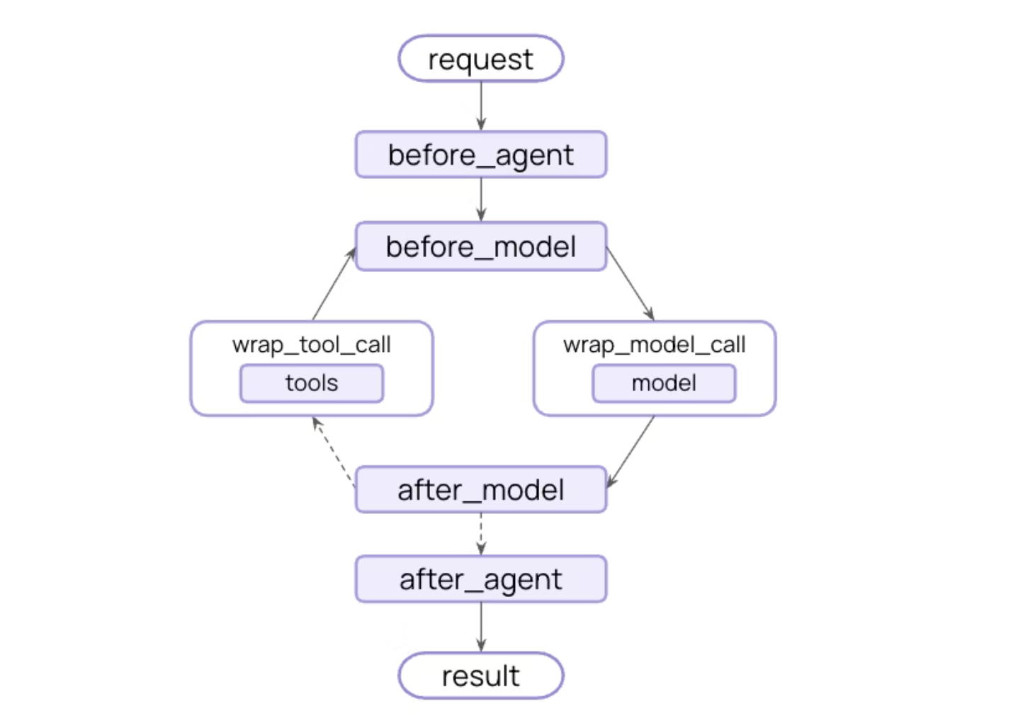 Middleware is the key bridge that takes LangChain from prototype to production. It exposes hooks at strategic points in the agent’s execution loop, allowing you to add custom logic without rewriting the core ReAct process.